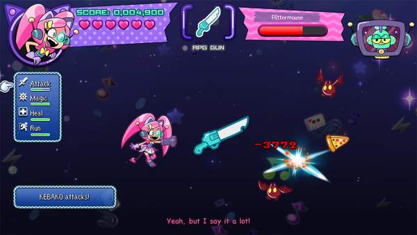 Mặc định, Kebako sử dụng Pea Shooter bắn ra những hạt đậu khiến tôi liên tưởng đến nhân vật Pea trong Plants vs Zombies. Tuy nhiên, các Gun Cartridge mang đến sự thay đổi khá hài hước và mới mẻ trong gameplay quen thuộc của thể loại shoot ’em up. Đơn cử như Dance Gun gợi ngay đến tựa game “nhảy thảm” Dance Dance Revolution kinh điển ngày xưa với những biểu tượng mũi tên từng khiến tôi một thời mê mẩn. Vũ khí độc đáo này đòi hỏi người chơi phải tương tác với các mũi tên xuất hiện trên màn hình thay cho thao tác bắn đạn và né tránh như thông thường của Kebako.